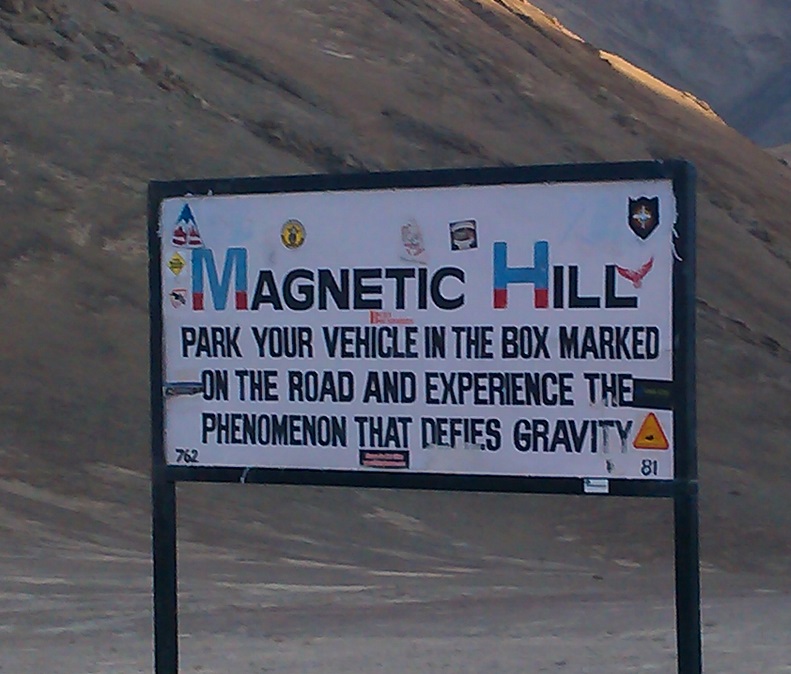এবারে আমরা মুখোমুখি হলাম প্রকৃতির এক অদ্ভুত খেয়ালের সঙ্গে। Magnetic Hill বা চৌম্বক পাহাড় লাদাখের এক দর্শনীয় স্থান। এখানকার ভৌগোলিক প্রকৃতি একটি চৌম্বকীয় আকর্ষণ এমনভাবে তৈরী করে যে পার্বত্য রাস্তায় যে গাড়ীর নীচে যাওয়ার কথা, চুম্বক ক্ষেত্রের প্রভাব মাধ্যাকর্ষণকে অতিক্রম করে তাকে উপরে টেনে নেয়। এই নিয়ে অবশ্য অনেক মতভেদ ও আছে, কারুর মতে এটি হল দেখার ভুল – Optical Illusion. আমার তরুণ পাঠকরা যখন যাবেন বেড়াতে, তারাই পরীক্ষার মাধ্যমে নির্ধারণ করে নেবেন। এর কাছেই পাথর সাহিব, সেটি গুরু নানকের স্মৃতি বিজড়িত একটি সুন্দর গুরুদ্বোয়ারা। গুরু নানক তিব্বত ভ্রমণ করে ফেরাকালীন এই গুরুদ্বোয়ারাতেই বিশ্রাম নিয়েছিলেন। আমরাও সেই প্রাতস্মরণীয় মহাজ্ঞানী, মহাজনের পন্থানুসরণ করে সেই গুরুদ্বোয়ারাতে আমরা কিছুক্ষণ বিশ্রাম নিলাম, প্রসাদও পেলাম।
